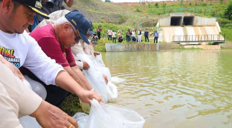 Pegawai Otorita IKN melakukan program penebaran benih ikan untuk meningkatkan ketahanan pangan dan menjaga keseimbangan ekosistem air di wilayah ibu kota baru.