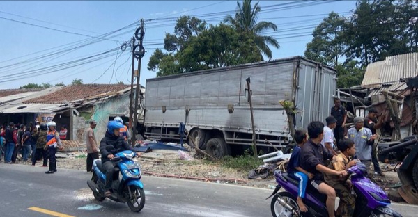 Truk tersebut diduga remnya lepas dan berhenti dengan dua sepeda motor yang melaju di depannya. Pembeli kemudian berbelok ke kanan dan menabrak rumah warga.
