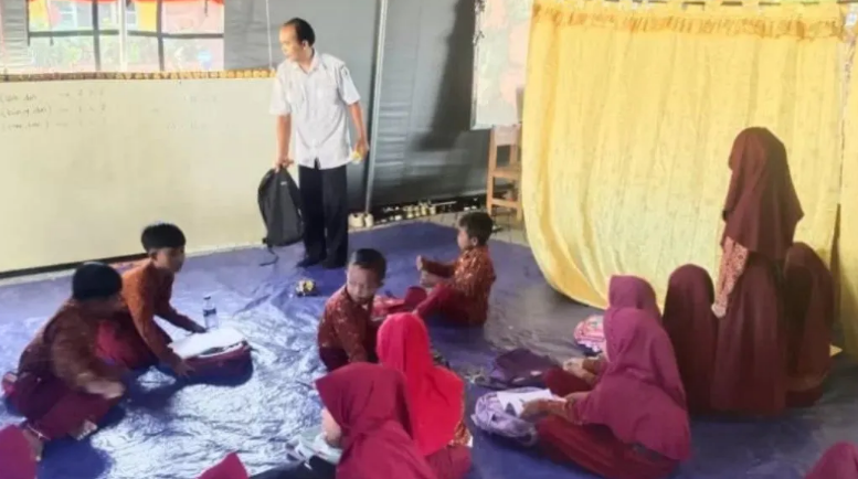 Mohammad Alwi, mengatakan, “KBM di tenda darurat dan sebagian menumpang di rumah warga ini terpaksa kami lakukan, karena ruang kelas sudah tidak bisa digunakan sama sekali.”