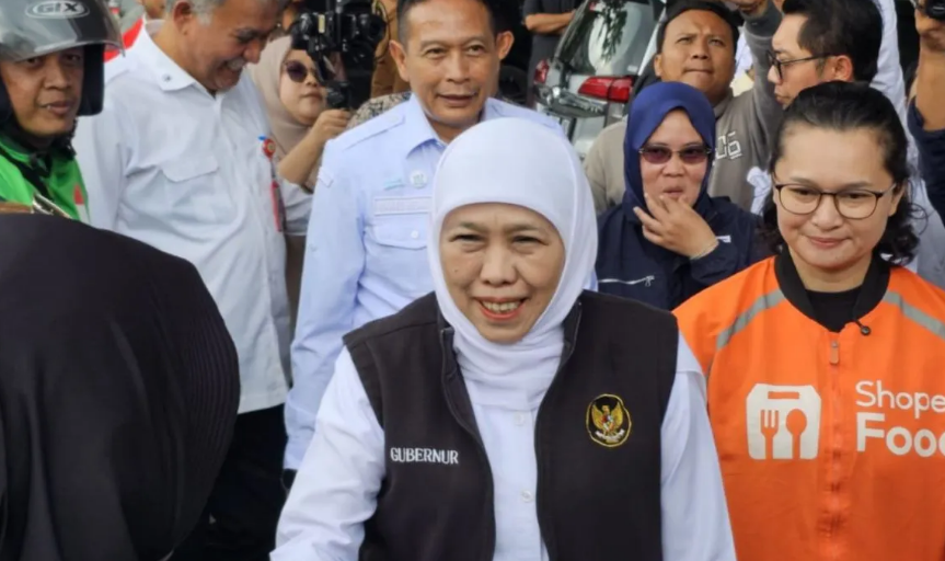 Khofifah menyatakan, “Kali ini berbagi dengan para pengendara ojek online, ada sembako dan BBM. Kami bersama-sama memberikan penguatan.”