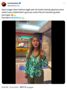 “Sabtu gimana? Sepi. Kebetulan di luar hujan dan sepi lagi,” unggah ulang akun Instagram Hotman Paris Hutapea pada Minggu (14/1/2024) kata Inul Daratista dalam video tersebut.