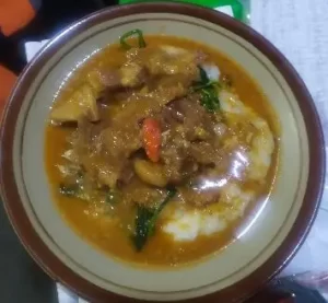 Sajian kuliner ini berupa menu nasi yang disajikan dengan koyor bumbu yang nikmat.