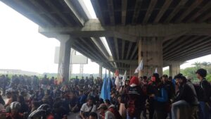 Bekasi, Intra62.com – Massa buruh melakukan aksi mogok nasional di Kawasan Industri Cikarang, Kabupaten Bekasi. Demonstrasi buruh digelar di dua lokasi, yakni Kawasan Industri MM2100 dan Kawasan Industri Gobel.