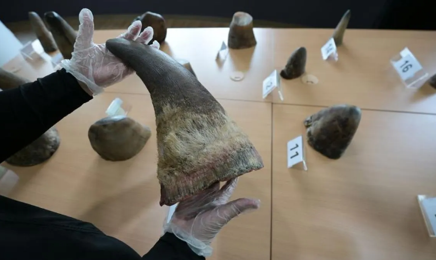 Menurut identifikasi spesies, 20 cula badak tersebut adalah cula Badak Putih. Bagian tubuh hewan lainnya masih perlu diidentifikasi.
